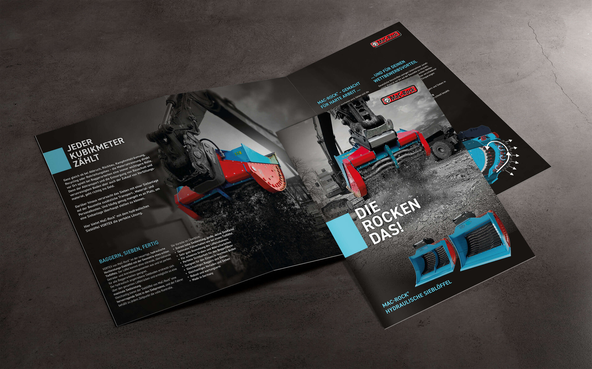 For the newcomer in the construction machinery industry, MaC-Rock®, we didn’t create just any product brochure. Instead, this six-page piece reflects what sets the company apart: innovation and a deep understanding of its target audience. With striking imagery and a modern design that showcases the innovation and performance of its hydraulic screening buckets — paired with a confident, no-nonsense tone that gets straight to the point.