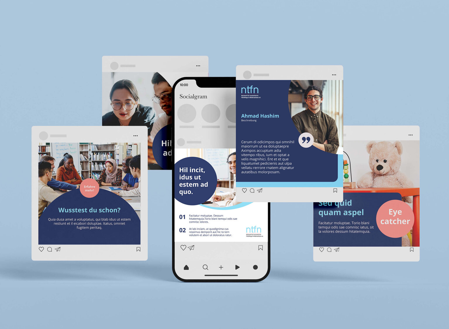 Ein zentrales Ziel war es, das NTFN langfristig zu befähigen, eigenständig zu arbeiten. Deshalb haben wir nicht nur gestaltet, sondern vor allem Systeme geschaffen: ein flexibles Icon-Set für wiederkehrende Inhalte, Social-Media-Templates, klar definierte Gestaltungsrichtlinien für den Alltag.